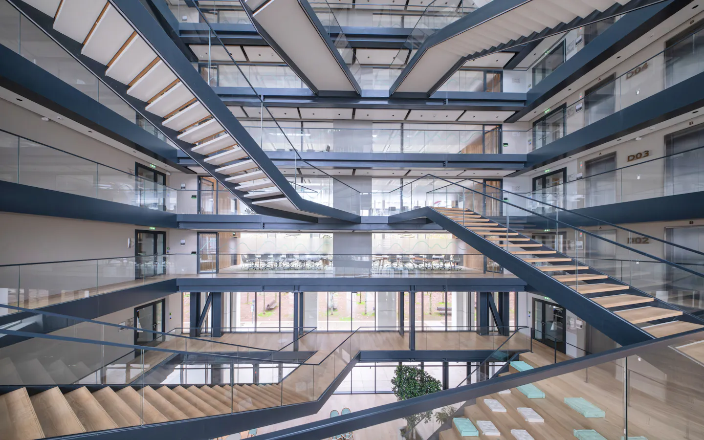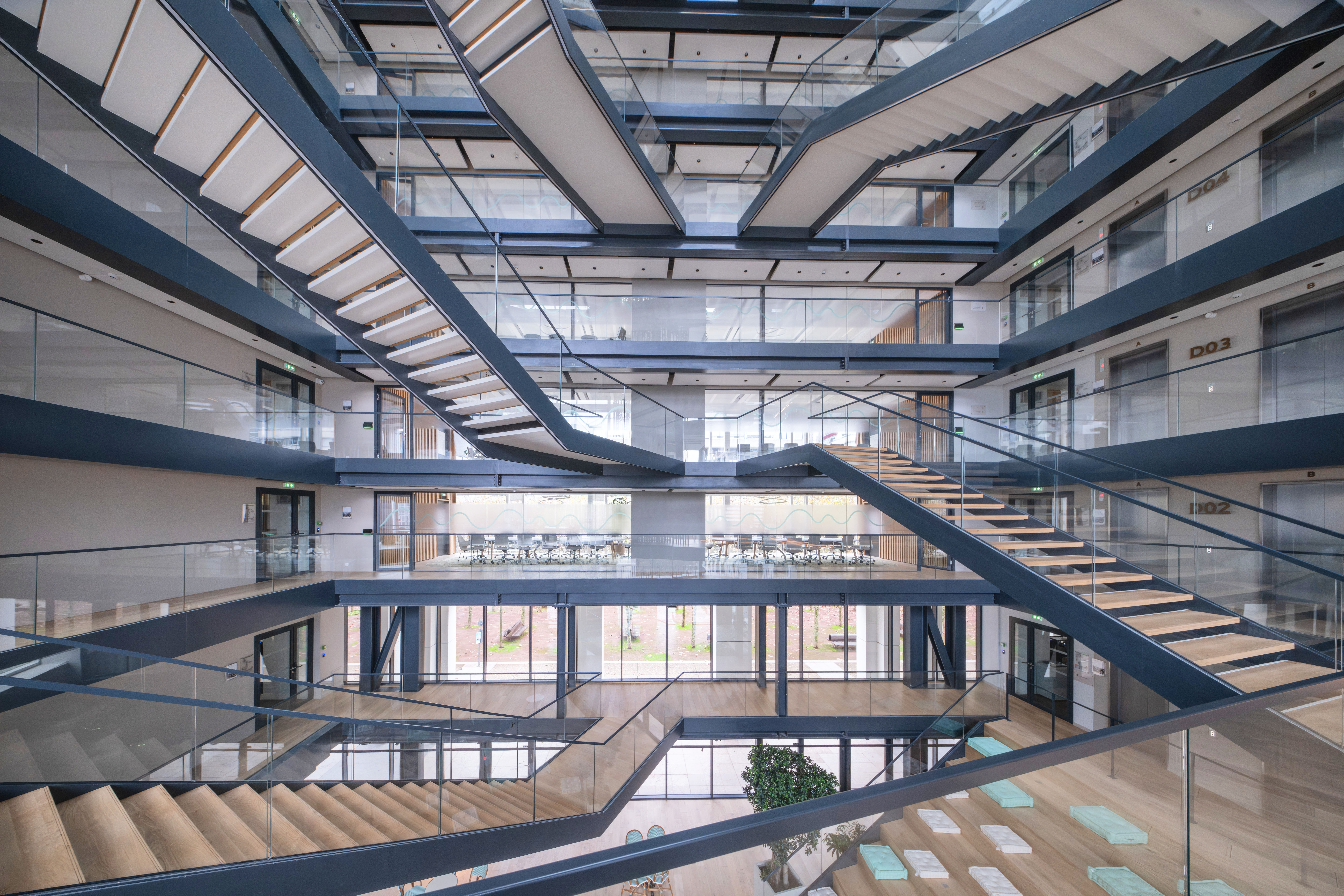 Un atrium central et des escaliers ouverts