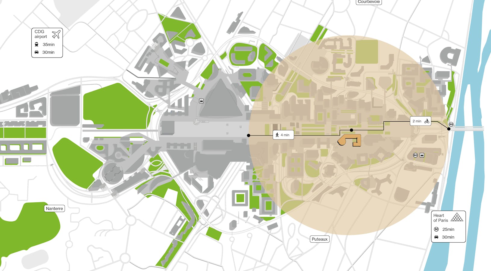 For cyclists, several new cycle lanes have already been created, providing direct links with Pont de Neuilly, Puteaux and Courbevoie. The Paris La Défense commitment is reflected by the creation of additional cycle lanes.