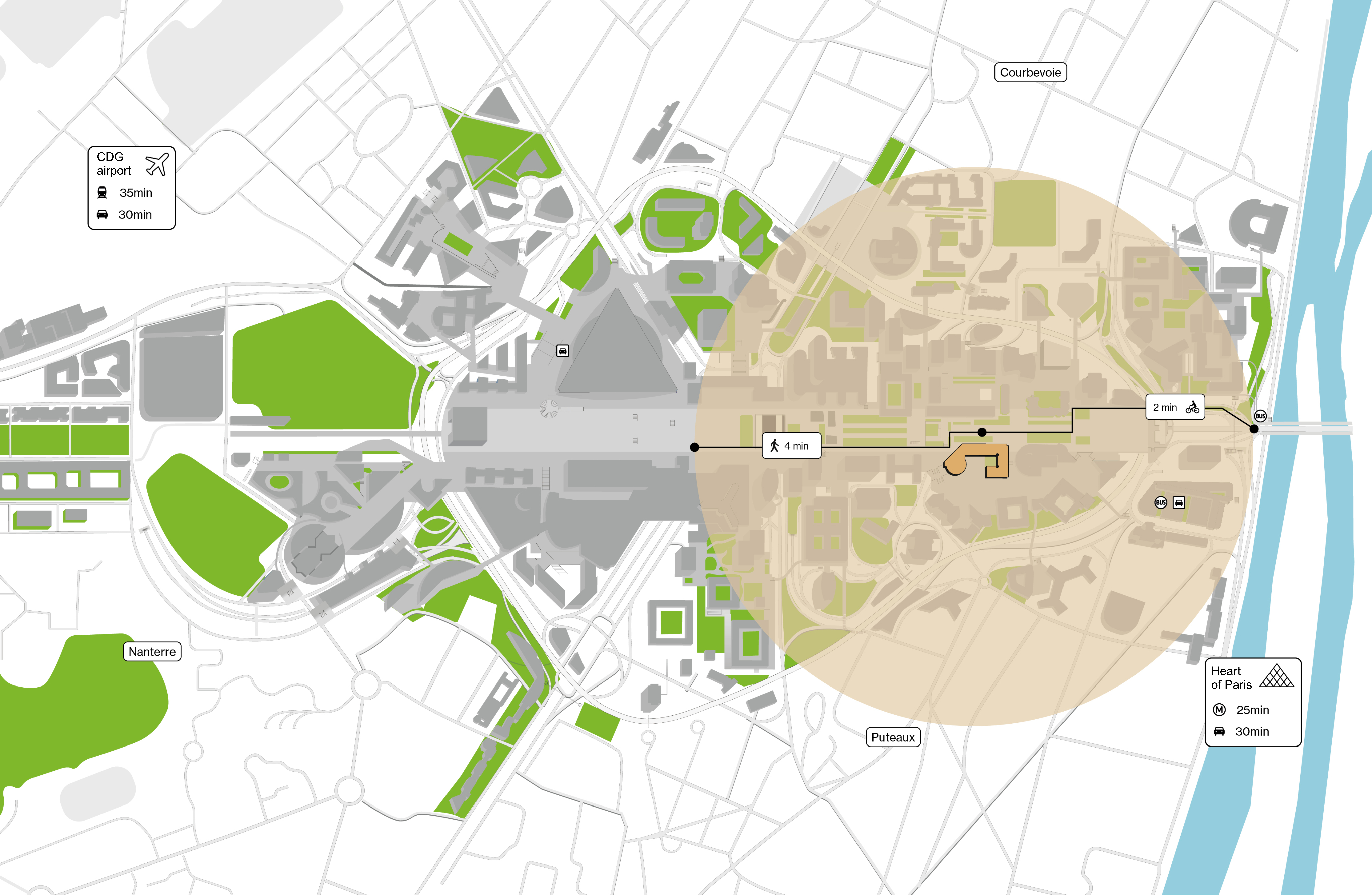 For cyclists, several new cycle lanes have already been created, providing direct links with Pont de Neuilly, Puteaux and Courbevoie. The Paris La Défense commitment is reflected by the creation of additional cycle lanes.